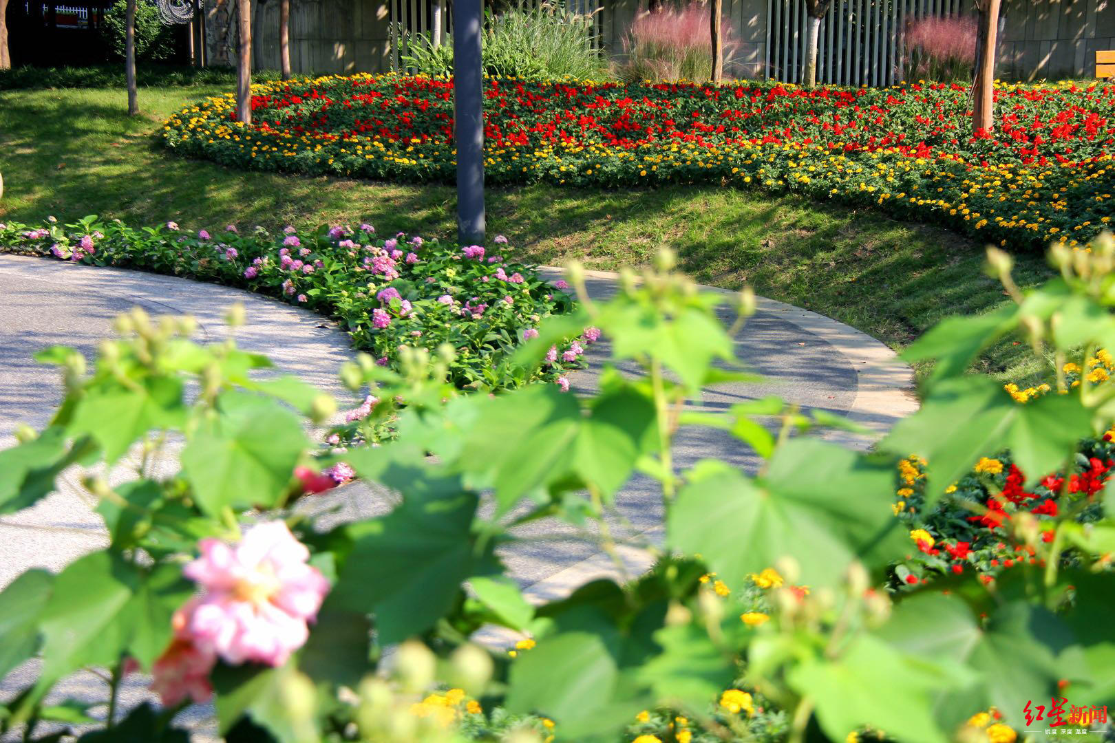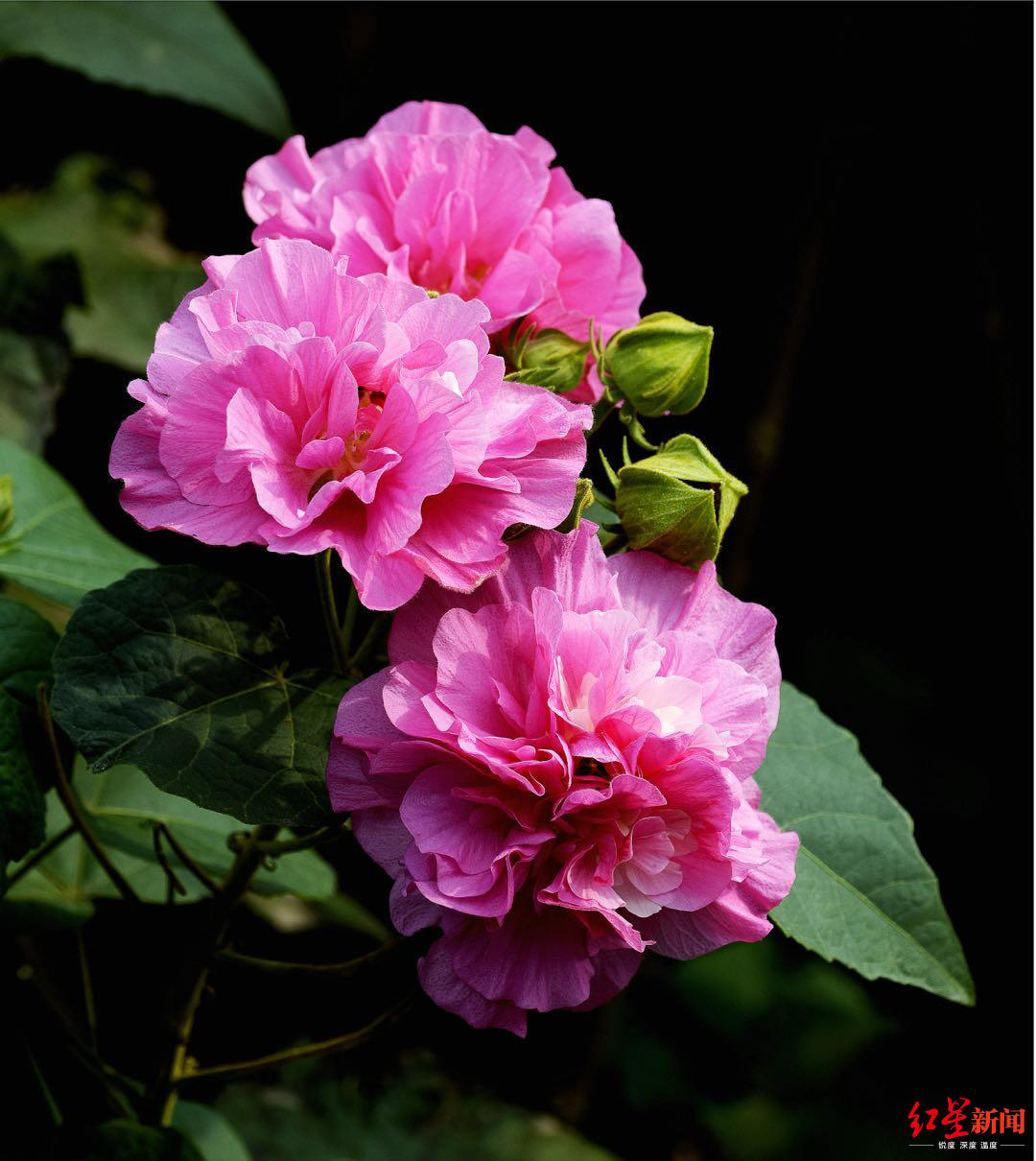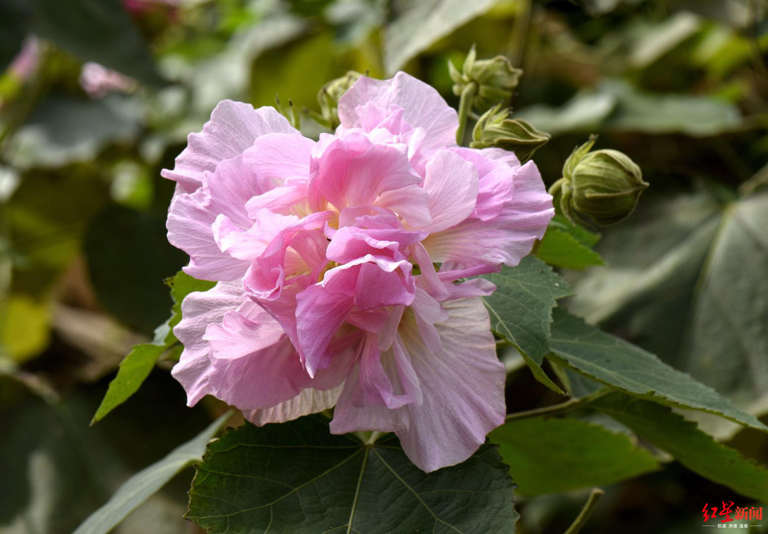 而在成华区北湖公园约4000平米的芙蓉花景中,种植着醉芙蓉、百日华彩、彩霞三个品种580余株,搭配着1000余平方米的坡地、时令花卉以及北湖湖水,同时红梅、海棠等30余种植物点缀其间。